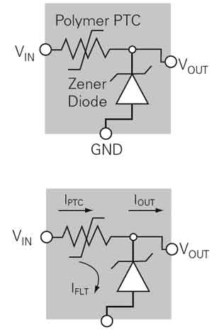 在正常工作時,VIN輸入電壓高于齊納二極管的擊穿電壓VZ,有IFLT電流經齊納二極管到地,VOUT輸出穩定的電壓。有不正常的過壓輸入 VIN時,則齊納二極管的IFLT會產生過流,當器件上有過流時,其電阻由低阻態瞬變到高阻態,使在其上的壓降大增,VOUT輸出基本不變,而流過齊納二極管的電流IFLT反而減小,如圖16所示。器件上電壓降的增大既保護了齊納二極管,又保護了下游的電路。另外,若被保護的下游電路中存在有局部短路或短路故障時,IOUT會增加,PPTC元件由低阻態變成高阻態,可使電路得到過流保護。