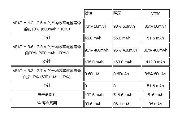 從表面上來(lái)看,設(shè)計(jì)人員若能繼續(xù)使用電池直到2.7V,并利用正電源降壓—升壓轉(zhuǎn)換器或是SEPIC轉(zhuǎn)換器提供3.3V電源,可攜式裝置的電池壽命就會(huì)大幅延長(zhǎng),但是根據(jù)(表一)針對(duì)600mAh電池所做的簡(jiǎn)單分析可發(fā)現(xiàn)情形并非如此,因?yàn)闊o(wú)論是采用效率更高的降壓轉(zhuǎn)換器,并將電池使用到3.3V,或是采用SEPIC之類的轉(zhuǎn)換器,并將電池電力完全用盡,這兩種方式的供電時(shí)間幾乎沒(méi)有任何區(qū)別。