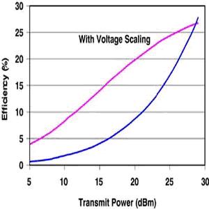 動(dòng)態(tài)/可適性電壓調(diào)整技術(shù)(DVS/AVS)與高整合度組件所使用的方式很類似,它會(huì)把閉回路系統(tǒng)中的處理器和穩(wěn)壓器連結(jié)在一起,并在確保系統(tǒng)正常工作的情形下,將數(shù)字電源供應(yīng)的輸出電壓動(dòng)態(tài)調(diào)整至最小值。功率放大器會(huì)被最佳化,使它在最大傳送功率下?lián)碛凶罡咝省S捎诮^大多數(shù)手機(jī)都在基地臺(tái)附近工作,手機(jī)的無(wú)線電功能會(huì)在維持通訊質(zhì)量的前題下,將傳送功率降至最低水平。當(dāng)功率放大器在較低的功率水平下工作時(shí),它的效率會(huì)受到影響,從(圖三)可以看出,利用動(dòng)態(tài)電壓調(diào)整技術(shù)來(lái)調(diào)整功率放大器的電壓,它的工作效率會(huì)增加10%至20%。