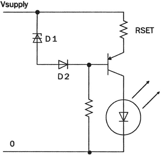 相對(duì)簡(jiǎn)單的方案是使用線性降壓穩(wěn)壓器(圖1),D1是一個(gè)穩(wěn)壓二極管,通過LED的電流設(shè)定為VD1/RSET。D2對(duì)基極二極管進(jìn)行濕度補(bǔ)償。這個(gè)電路仍然存在能量損失問題和電阻散熱問題。對(duì)于低電流LED,尤其是串聯(lián)后的LED正向壓降和稍低于電源電壓的場(chǎng)合,這個(gè)電路不失為經(jīng)濟(jì)有效的方案。