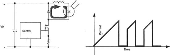 最簡(jiǎn)單的開關(guān)穩(wěn)壓器是圖2所示的降壓穩(wěn)壓器,輸入電壓與LED電壓之間的壓差對(duì)電感L充電,電流隨之增加,當(dāng)電流達(dá)到預(yù)設(shè)的值時(shí),控制電路將串聯(lián)的晶體管關(guān)閉,在LED通路形成一個(gè)交變電流。注意,在LED驅(qū)動(dòng)應(yīng)用中,開關(guān)穩(wěn)壓電路控制電流的峰值。