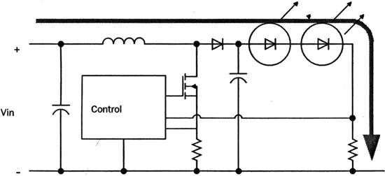這個(gè)值由可編程IC或外部元件來設(shè)定。電流值也由FET開關(guān)漏極上檢測(cè)電阻來定義。降壓穩(wěn)壓器流過LED的電流是連續(xù)的,但是交變的,而對(duì)電源而言是不連續(xù)的,這對(duì)電源工作會(huì)產(chǎn)生一定的影響,也增加了電源線上的噪聲。