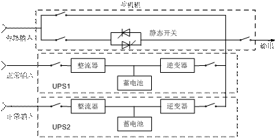 目前,為了提高UPS的可靠性,主要采用主從結構的UPS“1+1”并聯備份,如圖4所示。雖然這樣在一定程度上提高了供電可靠性,但是不便于離線維護、擴容,同時也造成設備利用不充分、缺乏靈活性等方面的缺陷。對于一些不能夠停電的用戶(例如醫療、銀行、金融、通信、國防等行業),UPS“1+1”并聯備份,還是存在很大的電力系統癱瘓隱患。