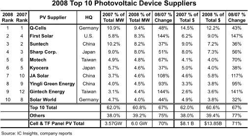 供應(yīng)量位居第三的是上年排名第二的尚德太陽能電力有限公司(Suntech Power Holdings),上年排名第三的夏普以與尚德的0.2個百分點之差下滑至第四。不過,在銷售額方面夏普位居第三,尚德以0.1個百分點之差退居第四。IC Insights評價夏普的薄膜硅太陽能電池增產(chǎn)及擴大銷售的計劃“很有野心”,并預測如果按照計劃推進,夏普將有望盡快奪回市場份額。