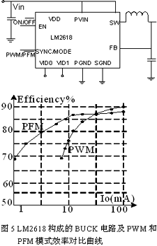 對于額定功率時(shí)工作在PWM模式的開關(guān)電源,,也可以通過切換至PFM模式提高待機(jī)效率,即固定開通時(shí)間,調(diào)節(jié)關(guān)斷時(shí)間,負(fù)載越低,關(guān)斷時(shí)間越長,工作頻率也越低。圖5是采用NS公司的LM2618控制的Buck轉(zhuǎn)換器電路和分別采用PWM和PFM控制方法的效率比較曲線。由圖可見,在輕載時(shí)采用PFM模式的電源效率明顯大于采用PWM模式時(shí)的效率,且負(fù)載越低,PFM效率優(yōu)勢越明顯。
