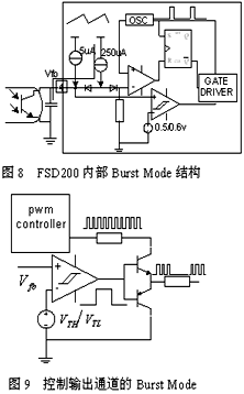 而FSD200則是通過控制內(nèi)部驅(qū)動(dòng)器實(shí)現(xiàn)可控脈沖模式,即將Vfo 腳的反饋電壓與0.6V/0.5V遲滯比較器比較,由比較結(jié)果控制門極驅(qū)動(dòng)輸出,其結(jié)構(gòu)可見圖8。我們可根據(jù)此原理用分立元件實(shí)現(xiàn)普通芯片的BurstMode功能,即檢測次級電壓判斷電源是否處于待機(jī)狀態(tài),通過遲滯比較器,控制芯片輸出,電路如圖9所示。