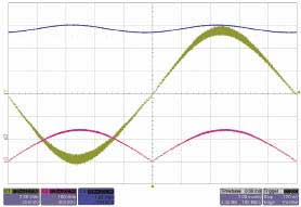 此外,它的功率要求很低,既提高了效率也降低了組件成本。該P(yáng)FC還帶有峰值限流、輸入電壓中斷保護(hù)功能,還有一個(gè)過(guò)壓比較器,可在發(fā)生負(fù)載突然減小事件時(shí)關(guān)斷PFC部分。時(shí)鐘輸出信號(hào)可用來(lái)同步下游的PWM級(jí),以減少系統(tǒng)噪聲。圖3中,綠色曲線的較厚區(qū)域代表電流紋波,PFCIC在峰值輸入電壓下消耗電流較多,過(guò)零時(shí)沒(méi)有電流。粉色曲線代表整流器輸入電壓,藍(lán)色曲線為輸出電壓。
