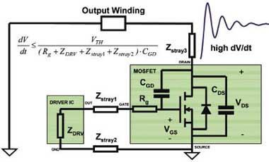 圖7解釋了讓柵極驅(qū)動(dòng)器靠近功率MOSFET為什么如此有用。柵極驅(qū)動(dòng)器的非零輸出阻抗ZDRV必須通過(guò)寄生阻抗Zstray1和Zstray2,以及柵極阻抗Rg來(lái)控制MOSFET,尤其是關(guān)斷。這時(shí),漏極上的高dV/dt加上柵極路徑上的高阻抗,可能引起MOSFET的寄生導(dǎo)通。而利用極短的連線和功能強(qiáng)大的柵極驅(qū)動(dòng)器,幾乎可以實(shí)現(xiàn)完美的開關(guān)。