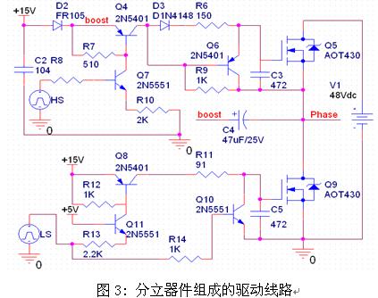 B.分立器件驅(qū)動電路用的器件較多,可靠性相對沒有半橋芯片的驅(qū)動電路高。但前提條件是半橋驅(qū)動芯片的驅(qū)動電路要設(shè)計(jì)合理。