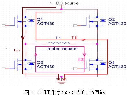 延長MOSFET的開通時間可以減小開通時的涌入電流。由于電機(jī)負(fù)載為感性負(fù)載,所以在PWM關(guān)斷時存在續(xù)流現(xiàn)象(見圖7中的I2),為了減小續(xù)流側(cè)反向恢復(fù)電流(Irr)的大小,PWM側(cè)開關(guān)管的開通速度不宜過快。由于MOSFET處于飽和區(qū)時有公式:Id=K*(Vgs-Vth)2,(K為一常數(shù),由MOSFET的特性決定)。所以在一定的溫度和Vds條件下,從MOSFET的門極驅(qū)動電壓Vgs可以判斷MOSFET中的電流大小。圖5中Vgs峰值為9.1V,圖6中Vgs峰值為6.4V,所以增加電容使得峰值電流減小。Id也可從MOSFET的轉(zhuǎn)移特性圖中獲得。