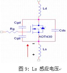 感應(yīng)柵極電壓如圖8中的CH1所示,其值已達(dá)到2.3V。另外,由于源極引線電感的存在,在Q3內(nèi)的電流迅速減小時,會在Ls的兩端感應(yīng)出一個極性為上負(fù)下正的電壓,如圖9所示,此時加在DIE上的電壓Vgs(die)要大于在外部引腳上測量的Vgs電壓,所以由于Ls的影響,使得MOSFET有提前導(dǎo)通的可能。如果下管由于感應(yīng)電壓而導(dǎo)通,則會造成上下管穿通,如果MOSFET不能承受此穿通電流,MOSFET就會損壞。