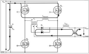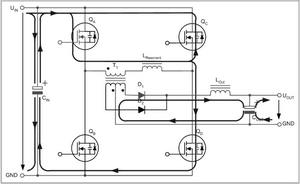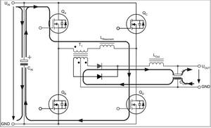 兩個(gè)互為對(duì)角的全橋開關(guān)不是同時(shí)驅(qū)動(dòng),而是通過相移的方法在啟動(dòng)命令之間引入預(yù)定義的短期延遲。這種延遲由控制電路的電壓回路進(jìn)行調(diào)節(jié),從而在兩個(gè)驅(qū)動(dòng)信號(hào)之間產(chǎn)生相移。這種相移技術(shù)的特殊之處在于,它可啟動(dòng)兩個(gè)與變壓器串聯(lián)的開關(guān),而變壓器的電壓卻為零。