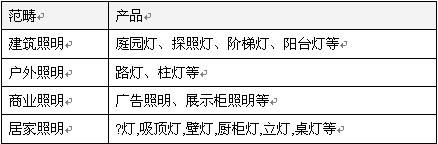 隨著技術的改善,LED燈具的用途已由過去數十年單純應用在指示燈、信號燈等,逐步使用在手機背光源、車內用照明、煞車燈、LCD電視、手提電腦背光源等輔助照明;而在近兩年內,其開始成為主照明系統,所應用的范疇可涵蓋建筑、戶外、商業、及居家等,產品則分別有: