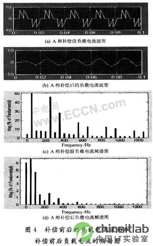 為了驗(yàn)證上述諧波檢測和控制方案的有效性以及由此構(gòu)成的基于DSP的并聯(lián)型有源電力濾波器是否能很好地補(bǔ)償諧波和無功電流,本文進(jìn)行了實(shí)驗(yàn)。采用阻性負(fù)載作為三相不控橋式整流器的負(fù)載,試驗(yàn)中在負(fù)載側(cè)接了1個2Ω的電阻。下面以A相為例給出實(shí)驗(yàn)波形。圖4分別給出了補(bǔ)償前后的負(fù)載電流波形和補(bǔ)償前后負(fù)載電流的頻譜圖。
