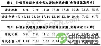 負(fù)載電流中含有高次諧波及無功電流時,負(fù)載電流總諧波畸變率THD=63.86%,負(fù)載電流中各次諧波電流含量見表1;補(bǔ)償后電源電流總諧波畸變率THD=5.35%,電源電流各次諧波電流含量見表2。