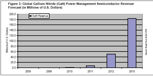 據iSuppli公司,由于高端服務器、筆記本電腦、手機和有線通訊領域的快速增長,氮化鎵(GaN)電源管理半導體市場到2013年預計將達到1.836億美元,而2010年實際上還幾乎一片空白。