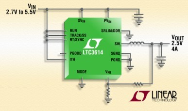 凌力爾特公司 (Linear Technology Corporation) 推出高效率同步降壓型穩(wěn)壓器 LTC3614,該器件采用恒定頻率、電流模式架構,能夠實現高達 4MHz 的開關頻率。低電阻內部開關允許采用 3mm x 5mm QFN 封裝的 LTC3614 提供高達 4A 的連續(xù)輸出電流,而且其低壓差工作允許輸出電壓范圍為 0.6V 至僅比 VIN 低數 mV。LTC3614 在 2.25V 至 5.5V 的輸入電壓范圍內工作,從而非常適用于單節(jié)鋰離子電池應用以及 3.3V 或 5V 中間總線系統(tǒng)。其開關頻率從 300kHz 至 4MHz 是用戶可編程的,因而允許使用纖巧、低成本電容器和電感器。
