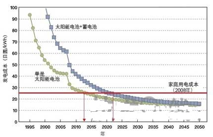 如同人們經(jīng)常指出的,太陽能發(fā)電確實也有缺點:下雨時輸出會很低,在陰天及其他情況時會有大幅波動,而且在夜晚時為零。然而,透過使用蓄電池后可以克服大部分的問題。如果配有蓄電池的太陽能發(fā)電系統(tǒng)達到與市電同價后,將會有很大的沖擊(其中包括減少石化燃料消耗)。日本經(jīng)濟產(chǎn)業(yè)研究所(RIETI)已預(yù)估大約2022年,配有蓄電池的家用太陽能發(fā)電系統(tǒng)將達到與市電同價(圖10)。