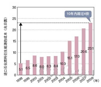 圖中顯示日本進口的化石燃料衍生能源。圖由是AIST的櫻井和環(huán)境部依據(jù)金融貿(mào)易統(tǒng)計而制。