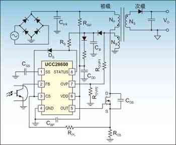 反激式控制IC就是利用這些技術開發的。比如,TI最近推出的UCC28600準諧振綠色模式反激式控制器就是此類IC的一種。它在反激式變換器中的典型配置如圖1所示。下文中我們將進一步討論這些技術是如何提高AC/DC轉換器的效率并優化節能的。