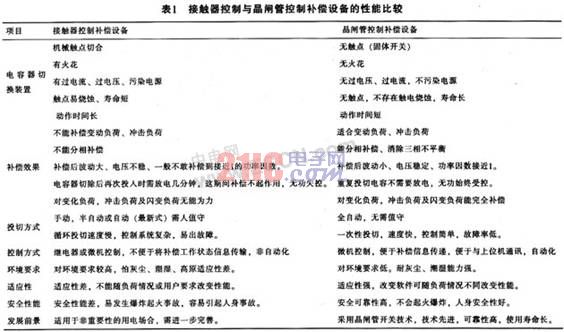 利用接觸器控制補(bǔ)償設(shè)備與用晶閘管控制方法來補(bǔ)償設(shè)備的性能比較如表1所列。