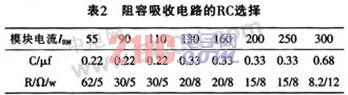 模塊過壓保護(hù)一般也可采用阻容吸收法。對(duì)于持續(xù)時(shí)間較短,能量不大的過電壓,一般可在模塊兩端并聯(lián)阻容吸收電路,用吸收電容把過電壓的電磁能量變成靜電能量存貯起來。而用吸收電阻不但可以防止電路振蕩,還可限制晶閘管導(dǎo)通時(shí)電容放電所產(chǎn)生的開通損耗和di/dt值。并聯(lián)在晶閘管開關(guān)模塊的RC值可參考表2。