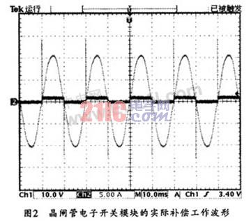 在無功補(bǔ)償實(shí)際應(yīng)用中,可將晶閘管電子開關(guān)模塊用在TSC低壓無功補(bǔ)償以替代接觸器,這樣,就可以在開關(guān)電壓過零時(shí)投入補(bǔ)償電容量,從而避免了沖擊電流的產(chǎn)生和瞬間電網(wǎng)電壓的波動(dòng)。圖2所示是其工作波形圖。