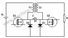 功率雙向流動CUK變換器(圖2)與傳統(tǒng)的單向功率流動CUK變換器不同的是:在原來開關管Q1和二極管D1兩端分別反向并聯(lián)二極管D2和開關管Q2如圖3所示。這個電路具有對稱性,輸入輸出電流方向可正可負。右邊負載R換為下正上負電壓源Vs,左邊電壓源Vs換為負載R,則功率從右向左倒流[2]。