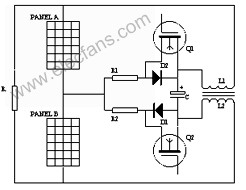 系統(tǒng)投入運行后,假設Ua>Ub,電壓環(huán)比例積分調(diào)節(jié)器的輸出高電平封鎖Q2的驅動電路,TL494的調(diào)制脈沖輸出端A(8腳)輸出PWM方波無效,只有Q1導通,功率從PANEL A流向PANELB,Ua下降,Ub上升,最終Ua=Ub。反之,Ua<Ub,電壓環(huán)比例積分調(diào)節(jié)器的輸出高電平封鎖Q1的驅動電路,TL494的調(diào)制脈沖輸出端B(11)腳輸出PWM方波無效,只有Q2導通,功率從PANELB流向PANELA,Ua上升,Ub下降,最終亦Ua=Ub。