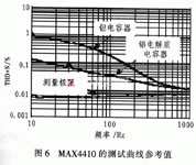 關于大容量電容器,圖6給出兩種100μF電容器和16電阻器組成的無源高通濾波器的THD+N與頻率的關系曲線。在100Hz、-3db截止頻率,兩種電容器的電壓系數均會導致THD指標惡化。100μF的鉭電容器在-3db截止頻點THD+N指標為0.2%。如果采用Maxim專有的DirectDrive放大器,因為省略了這個大容易輸出耦合電容器,可大大改進低頻和音頻質量。在圖6所示曲線中,MAX4410測試曲線近似等于參考值。