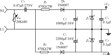 輸入電路的電阻R1(或R1、R2)要采用品質較好的金屬膜電阻或水泥電阻,功率2~5W,阻值100~820Ω;降壓電容C2(或C5)采用高質量的高壓金屬化聚丙烯電容,一般0.22~0.47μF,耐壓應≥AC250V,電容的容量過大會引起視在功率超標。