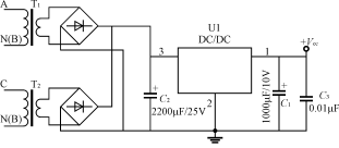 三相電度表有三相三線,三相四線,輸入電壓有3×(220~240)V/380~400V、3×57V/100V等。三相電度表供電電路可以參考單相電度表電源的設計方法,對于三相四線供電電路,可以在每一相線對零線之間接1只線性變壓器,共3只線性變壓器;對三相三線可以取一相如Β相作為公共地線,A、C相對Β相接2只線性變壓器。這些變壓的副邊單獨整流后再將輸出的正極接在一起、負極接在一起,經電容濾波后,再通過DC/DC變換器輸出穩定電壓,向電度表供電,如圖5所示。