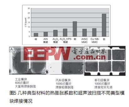 IGBT模塊由多層不同材料組成(見圖3),每種材料具有不同的CTE(熱膨脹系數(shù)),CTE的差別會(huì)影響功率模塊的使用壽命,當(dāng)模塊使用時(shí),溫度的變化會(huì)在不同層間產(chǎn)生機(jī)械應(yīng)力而導(dǎo)致焊接脫落,我們的目標(biāo)是選用熱膨脹系數(shù)差別盡可能小的材料來進(jìn)行焊接組合。但另一方面,即使它們的熱膨脹系數(shù)十分匹配,因?yàn)椴牧媳旧淼某杀究赡軙?huì)太高,或者在生產(chǎn)過程中難以被加工或加工成本太高。例如列車牽引應(yīng)用中的AlSiC基板。熱膨脹系數(shù)和襯底幾乎相同,因此有更好的熱循環(huán)特性。但對(duì)混合動(dòng)力車應(yīng)用因成本過高而很難被接受。