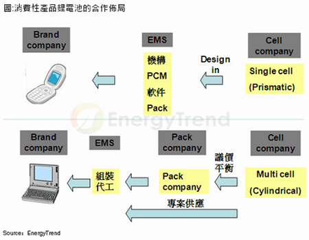 以產品發展競爭來看,EnergyTrend表示,手機以及筆記本電腦一直是鋰電池的最大戰場,但也因為產業平衡的關系而產生出不同的合作模式。以手機電池來說,中端與低端產品市場,大多以價格為考量,也因此將使得產品定位陷入品質與價格之間的掙扎,而高價位產品,則必須藉由在產品設計初期的共同發展,來設法讓零組件產品確保切入供應鏈,包括正崴等手機電池廠即為一例。