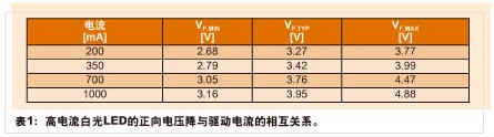 為了確保最佳的性能和長久的工作壽命,LED需要一個(gè)有效的驅(qū)動電路。這些特殊的驅(qū)動電路必須能夠從一根相當(dāng)苛刻的汽車電源總線獲取工作電源,而且還應(yīng)兼具成本和空間“效益性”。為了維持其長久的工作壽命,一定不得超過LED的電流和溫度限值。表1羅列了針對一個(gè)高電流白光LED的典型正向電壓與驅(qū)動電流的相互關(guān)系。