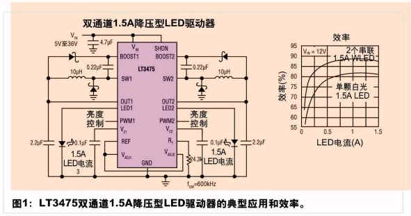 LT3475是一款雙通道、36V、2MHz降壓型DC/DC轉(zhuǎn)換器,專為用作恒定電流雙LED驅(qū)動器而設(shè)計(jì)(見圖1)。每個(gè)通道具有一個(gè)內(nèi)部檢測電阻器和調(diào)光控制功能,從而使其非常適合于驅(qū)動那些需要高達(dá)1.5A電流的LED。一個(gè)通道的開關(guān)操作與另一個(gè)通道異相180°,因而使得兩個(gè)通道的輸出紋波均有所減小。每個(gè)通道均獨(dú)立地在一個(gè)50mA至1.5A的寬電流范圍內(nèi)保持了很高的輸出電流準(zhǔn)確度,而獨(dú)特的TrueColorPWMTM電路提供了一個(gè)3000:1的調(diào)光范圍,且未發(fā)生任何的色偏移(這種現(xiàn)象在LED電流調(diào)光中很常見)。