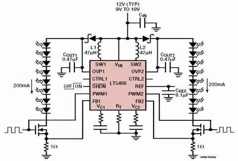 為了實(shí)現(xiàn)這些LED剎車燈的性能和工作壽命的最大化,應(yīng)采用一種能夠驅(qū)動這些剎車系統(tǒng)所需的紅光LED串的合適LED驅(qū)動器,這是必不可少的。凌力爾特的LT3486便是專為此類汽車應(yīng)用而開發(fā)的。LT3486是一款雙通道升壓型DC/DC轉(zhuǎn)換器(如圖2所示),專為從一根12V至14V汽車總線以恒定的電流來驅(qū)動多達(dá)16個(gè)LED(每個(gè)轉(zhuǎn)換器驅(qū)動8個(gè)串聯(lián)LED)而設(shè)計(jì)。采用LED串聯(lián)的方式能夠提供相等的LED電流,從而獲得均勻的LED亮度。在需要的時(shí)候,兩個(gè)獨(dú)立的轉(zhuǎn)換器還能夠驅(qū)動不對稱的LED串。