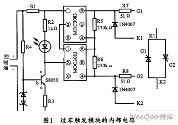 由于切除的電容器上一般都有剩余電壓,而電容器兩端的電壓不能突變,因此,當系統電壓和電容器殘壓的差值較大時,觸發晶閘管會產生很大的沖擊電流,而可能直接損壞晶閘管。為了實現動態無功補償裝置快速響應,同時又保證投切無沖擊電流,因此需要檢測電容器電壓和電網電壓。只有當兩者大小相等、極性相同時,才能瞬時投入電容。因此需要加裝過零觸發模塊。目前,從晶閘管兩端取得過零信號的典型觸發電路是MOC3083。MOC3083芯片內部有過零觸發判斷電路,它是為220V電網電壓設計的專門芯片,其芯片的雙向可控硅耐壓為800V。在4、6兩端電壓低于12V時,如果輸入觸發電流,其內部的雙向可控硅導通。圖1所示是用在380V電網的TSC電路上串聯兩只MOC3083的過零觸發模塊的內部電路圖。