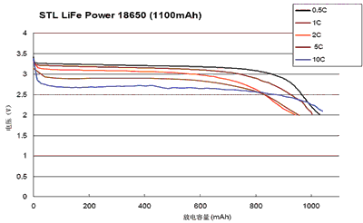 一種型號(hào)為STL18650的磷酸鐵鋰動(dòng)力電池(容量為1100mAh)在不同的放電率時(shí)其放電特性如圖2所示。最小的放電率為0.5C,最大的放電率為10C,五種不同的放電率形成一組放電曲線。由圖2中可看出,不管哪一種放電率,其放電過程中電壓是很平坦的(即放電電壓平穩(wěn),基本保持不變),只有快到終止放電電壓時(shí),曲線才向下彎曲(放電量達(dá)到800mAh以后才出現(xiàn)向下彎曲)。在0.5~10C的放電率范圍內(nèi),輸出電壓大部分在2.7~3.2V范圍內(nèi)變化。這說明該電池有很好的放電特性。
