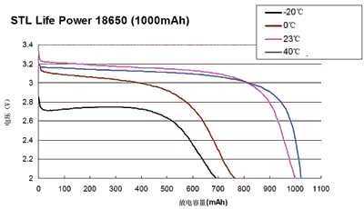 容量為1000mAh的STL18650在不同的溫度條件下(從-20~+40℃)的放電曲線如圖3所示。如果在23℃時(shí)放電容量為100%,則在0℃時(shí)的放電容量降為78%,而在-20℃時(shí)降到65%,在+40℃放電時(shí)其放電容量略大于100%。
