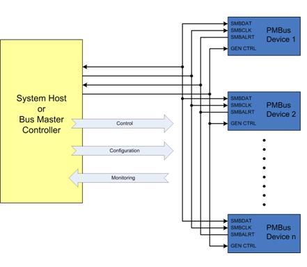 系統(tǒng)主機(jī)可以是安裝于印刷電路板(PCB)上作為電源管理總線裝置的實(shí)體裝置,如現(xiàn)場可編程門陣列(FPGA),微處理器或通用的微控制器,也可以是處于系統(tǒng)外部的控制實(shí)體,如自動檢驗(yàn)設(shè)備,甚至可以是臺式電腦中的控制軟件。能夠用于系統(tǒng)管理總線通信的任何物體均可用作電源管理總線系統(tǒng)的界面。