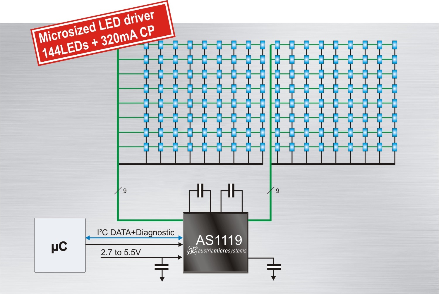 AS1119可驅動144顆LED,憑借其最佳調光控制和片上電荷泵,不僅可創造出色彩豐富且流暢的動畫,同時延長了電池壽命。