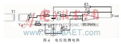 電壓檢測主要用來實時檢測常用和備用電源的電壓。PIC16F884單片機有14通道的10位A/D轉換器,可以滿足電壓采樣的精度。由于PIC16F884單片機只能對0~5V間的單極性電壓進行檢測,故需要對交流電壓進行提升使它成為單極性的電壓信號。電壓檢測電路如圖4所示[1]。