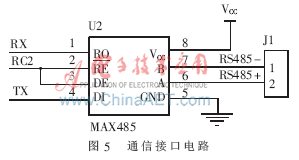 為了使控制器能夠方便地與上層控制平臺進行聯網通信,實現控制器的遠程控制、遠程監控等功能,本設計為控制器添加了通信接口,采用簡單經濟、廣泛應用于工業上的RS485總線與外界進行通信。RS485采用差分信號進行傳輸,有較好的抗干擾能力,通過轉換模塊很容易實現從RS485到RS232的信號轉換,從而便于和上位計算機通信。選用了Maxim公司的MAX485芯片作為通信控制的主要器件,其工作電源為+5V,采用半雙工通信方式,能夠將TTL電平轉換為RS485電平,內部包含了1個驅動器和1個收發器,通過串口可以方便地與PIC16F884進行通信。MAX485的接口電路如圖5所示。