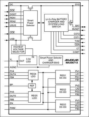 任何便攜電子系統都要求低成本、小尺寸、輕便。而為板上子系統設計電池充電及供電電路時,用電源管理IC可以方便地實現上述功能。這類的器件有很多,比如Maxim公司的MAX8671X,其可以從USB口或外部交流適配器獲取電源,為鋰離子或鋰聚合物電池充電。除了充電功能外,該器件內部還集成了用于USB和直流輸入的過壓保護開關,5路獨立的片上穩壓器,這一組合大大減少了電路板的外部元件數量。