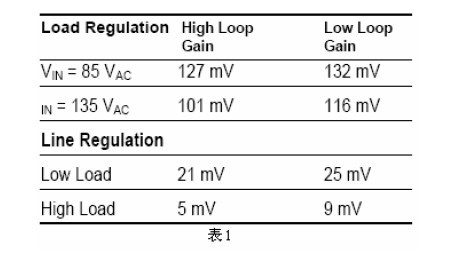 構造一個150W的電流模式正激轉換器,經過修正的小信號環路特性顯示出它在系統瞬態響應時所起的作用。圖13(原文誤為圖12,譯注)給出它的增益-相位圖。與圖11所展示的一樣,獲得了相同的博得圖曲線。此增益相位圖顯示這個系統有86.7度的相位裕量。意味著穩定的系統有快速的瞬態響應。圖15(原文誤為圖13,譯注)給出系統的瞬態響應。為了展示相位裕量的作用,通過增加整個系統的增益和提高穿越頻率,系統的相位裕量會減少。穿越頻率提高時系統的相位裕量在減少。圖12(原文誤為圖14,譯注)給出更高的穿越頻率和更少的相位裕量(65度)時的系統博得圖。其瞬態響應見圖14(原文誤為圖15,譯注),注意更少的相位裕量導致更大的振蕩和更長的調節時間。表1比較了這兩個不同增益大小的系統之間線性和負載調節率的變化。正如前面所述,高的環路增益得到更緊密的線性和負載調節率。還應該注意需在高的相位裕量和較低的環路增益之間取得平衡。