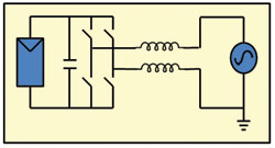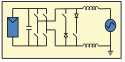 無變壓器的DC/AC逆變器在歐洲廣泛應用,但是在美國,這種產品只是最近才在某些地區(qū)被使用。無變壓器的逆變器拓撲結構有很多種,而Fraunhofer研究所開發(fā)的HERIC拓撲表現出了很高的效率。傳統的全橋逆變器的結構如圖1所示,HERIC拓撲如圖2所示,此圖中還顯示了兩種新的開關/二極管對。這種拓撲利用獨有的續(xù)流路徑來減小開關和導通損耗,使效率提升到98%以上。