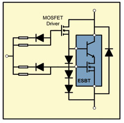 當一個ESBT同外置MOSFET和二極管/電阻配對的時候,整個電路看起來像一個3端器件,經驅動后能達類似IGBT或功率MOSFET的工作狀態(tài)。ESBT的關斷能量比IGBT低很多,能實現高效設計,并非常適合高頻率、高壓逆變器設計。