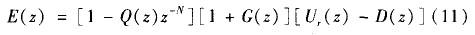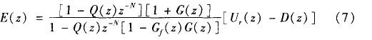 Q(z)、Gf(z)為低通濾波補償器,是重復控制器設計工作的重點。P(z)的作用是將開環增益調節至很大的有限值,在不影響穩態精度的前提下保證系統穩定性;Gc(z)的作用是通過限制重復控制器的頻帶范圍來提高系統的魯棒性 。由圖可得到系統的誤差傳遞函數為: