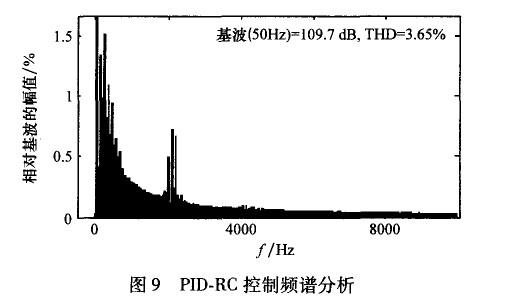 在高頻段,開環增益變得非常小,這對抑制高頻噪聲,提高系統穩定性和魯棒性是非常有幫助的。但是,在非諧波頻率處,沒有嵌入重復控制器的系統開環增益更大一些,這說明重復控制器對位于該頻率的信號控制效果較差。因此,PID控制器在系統中除了有提高系統動態響應速度的作用外,還要調節非諧波信號,彌補重復控制器的不足。